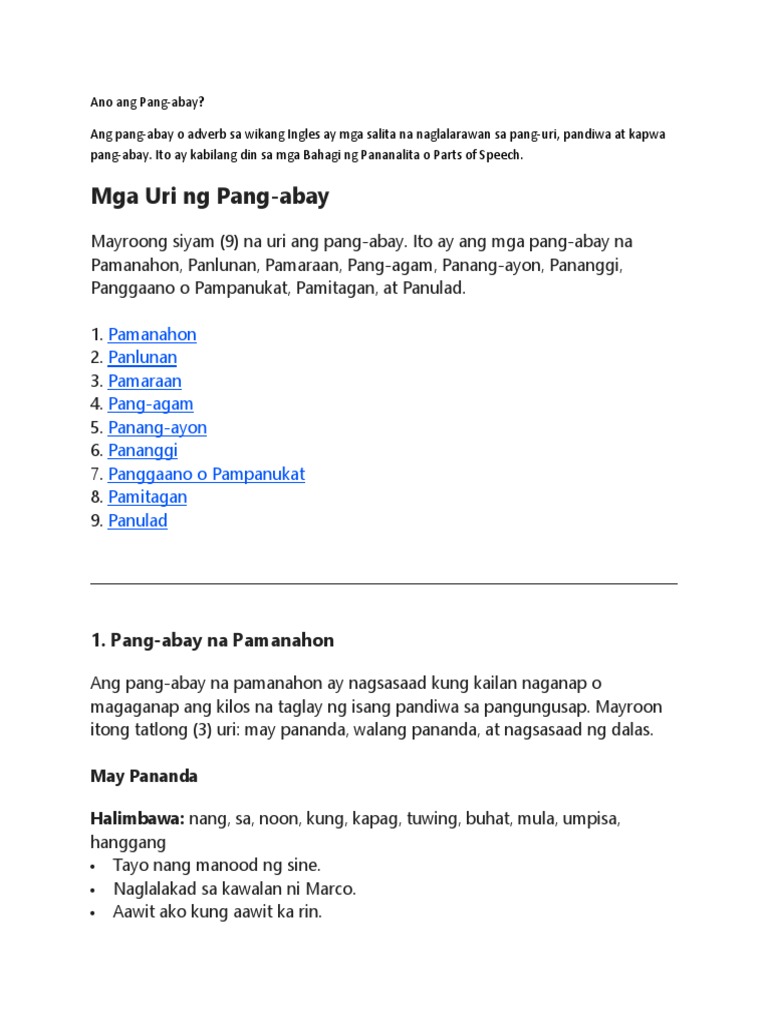 Mayroon itong tatlong uri. Tila patuloy na ang pag-unlad ng turismo sa Pilipinas. Pang-abay na Pamanahon tumutukoy ito sa panahon kung kalian naganap ang isinasaad na aksyon ng pandiwa.