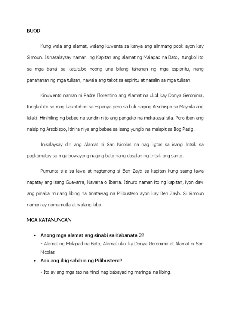 Alamat Buod Nauwi ang usapan sa ibabaw ng kubyerta sa mga alamat. Gayon din ang Pilipinas na noong bago dumating ang mga Kastila ay pinamamayanihan ng mga pamahiin Kapre tiyanak tikbalang aswang at iba pa. Iyan ang alamat ng Malapad na batoNang marinig ni Simoun ang salitang tumaob na Bangka ay naluha ito naaalala niya ang kanyang tagapagligtas na kaibigan ni si Elias Nang papasok na Barko sa lawa ay biglang nagtanong si Ben Zayb kung saang parte daw ban g lawing iyon nabaril ang isang pilibustero na nagngangalang Guevarra om Ibarra lahat ay kinilabutan at napatingin sa kapitan.
