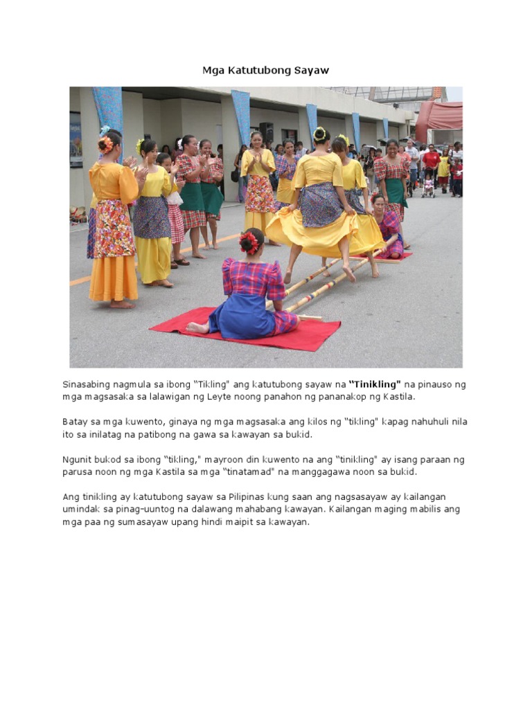 Pinangalan itong sayaw na ito sa ibong Tikling na katutubo sa Leyte. Ilang piling manananghal ang patuloy na bumubuhay sa mga katutubong sayaw ng bansa ang kilala rin sa ibat ibang sulok ng mundo. 2018-05-12 Pinakikita rin sa pamamagitan ng katutubong sayaw ng Pilipinas ang maalab na damdamin pag-ibig kasiyahan kabuuan ng loob pagkakaisa at pagkakaiba na hudyat ng isang bansang binubuo ng 7641 isla.